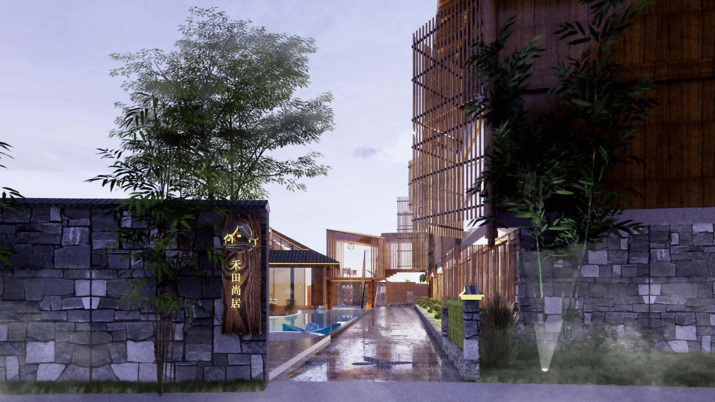 设计借鉴龙胜当地中国少数民族中的苗族文化元素,进行用分离与新元素组合的形式传承,结合山地环境营造出隐没山林的世外意象,让游客体验到龙胜梯田的神秘与优美并沉醉于当地民族风俗。